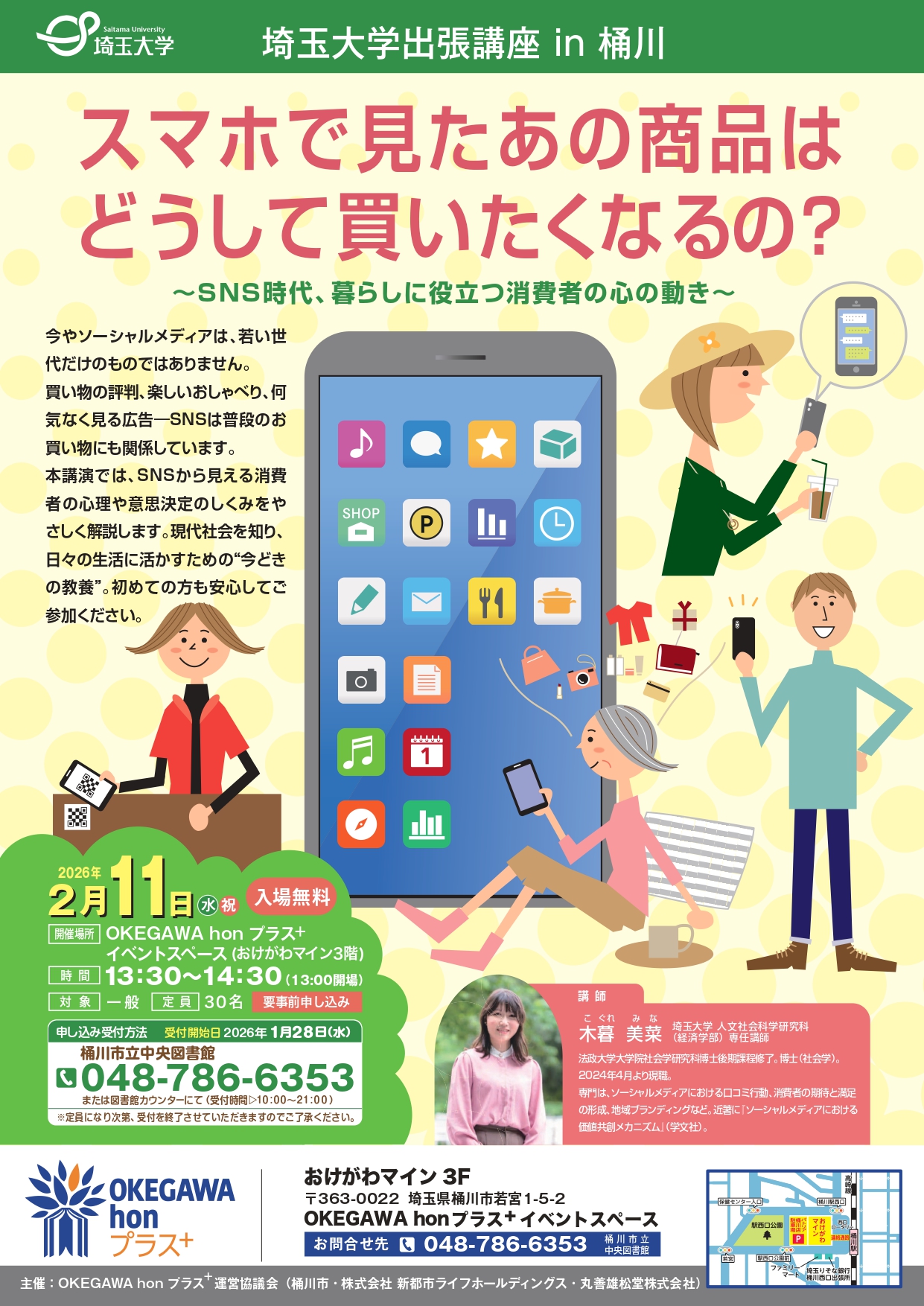 | 詳細内容 | 埼玉大学出張講座 in 桶川 「スマホで見たあの商品はどうして買いたくなるの?」 ~SNS時代、暮らしに役立つ消費者の心の動き~ 今やソーシャルメディアは、若い世代だけのものではありません。 買い物の評判、楽しいおしゃべり、何気なく見る広告-SNSは普段のお買い物にも関係しています。 本講演では、SNSから見える消費者の心理や意思決定のしくみをやさしく解説します。現代社会を知り、日々の生活に活かすための“今どきの教養”。初めての方も安心してご参加ください。 |