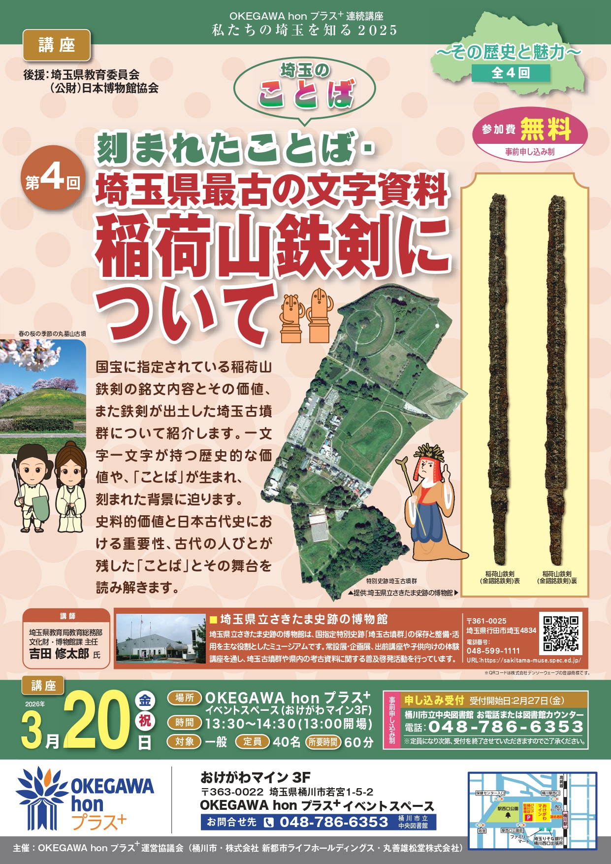 | 詳細内容 | OKEGAWAhonプラス+連続講座 私たちの埼玉を知る2025 「埼玉のことば」 第4回 刻まれたことば・埼玉県最古の文字資料 稲荷山鉄剣について 国宝に指定されている稲荷山鉄剣の銘文内容とその価値、また鉄剣が出土した埼玉古墳群について紹介します。一文字一文字が持つ歴史的な価値や、「ことば」が生まれ、刻まれた背景に迫ります。 史料的価値と日本古代史における重要性、古代の人びとが残した「ことば」とその舞台を読み解きます。 |