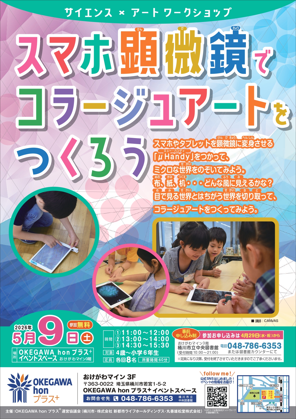 | 詳細内容 | スマホ顕微鏡でコラージュアートをつくろう スマホやタブレットを顕微鏡に変身させる「μHandy(ミュー・ハンディ) 」をつかって、 ミクロな世界をのぞいてみよう。 布、紙、机・・・どんな風に見えるかな? 目で見る世界とはちがう世界を切り取って、 コラージュアートをつくってみよう! ※μHandy(ミュー・ハンディ)は、スマートフォンに取り付けるだけで、 従来の顕微鏡よりも簡単に観察を行える、コンパクトな顕微鏡です。 【受付状況】※4月29日(水曜祝日)10時より受付開始