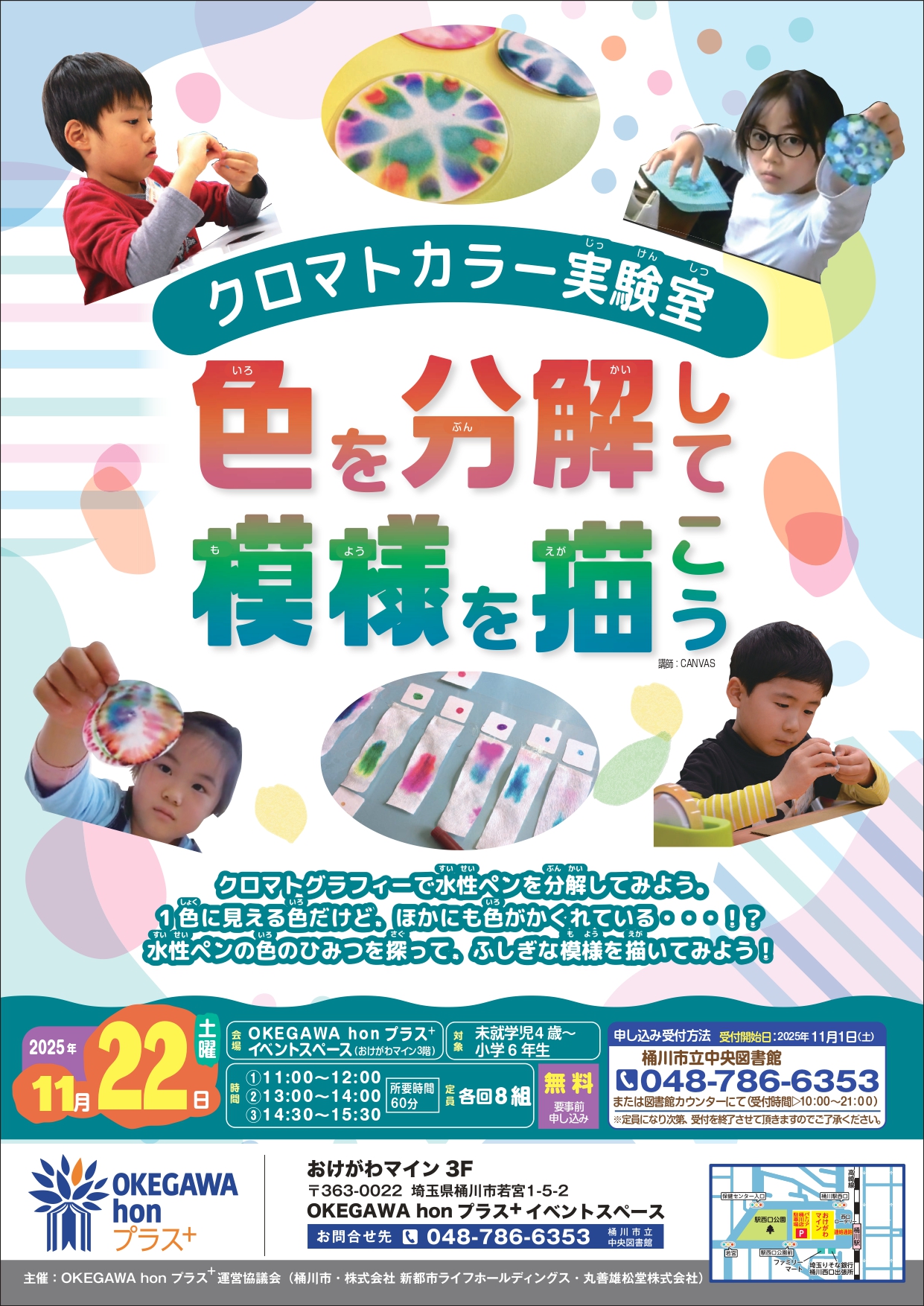 | 詳細内容 | クロマトカラー実験室 色を分解して模様を描こう クロマトグラフィーで水性ペンを分解してみよう。1色に見える色だけど、ほかにも色がかくれている…!?水性ペンの色のひみつを探って、ふしぎな模様を描いてみよう! |