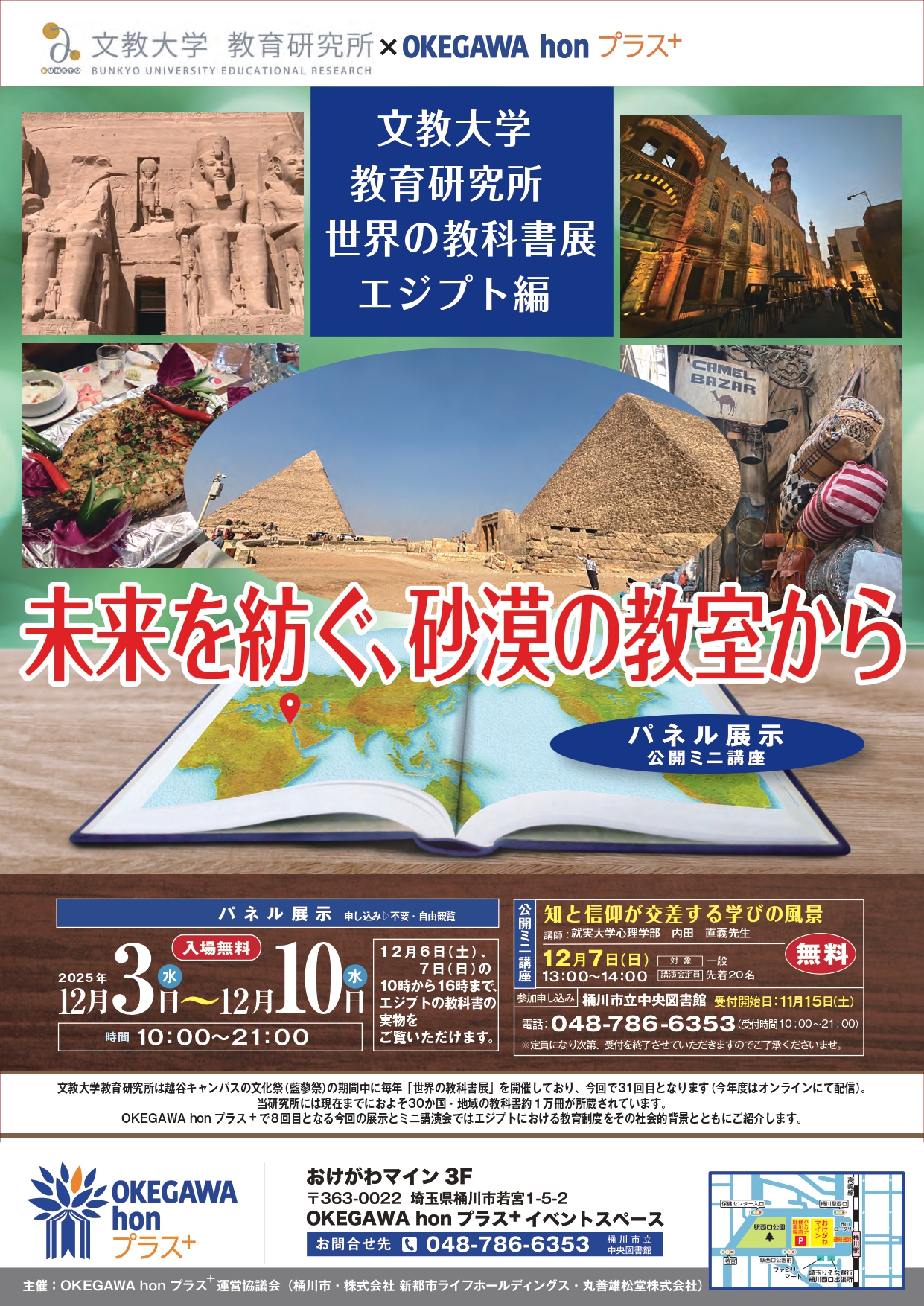 | 詳細内容 | 文教大学教育研究所は越谷キャンパスの文化祭の期間中に毎年 「世界の教科書展」を開催しており、今年で31回目となります。 (今年度はオンラインにて配信) OKEGAWA honプラス+で開催8回目となる今回の展示とミニ講演会では、エジプトにおける教育制度をその社会背景とともにご紹介します。 パネル展示の期間中には、就実大学の先生をお招きし公開ミニ講座が開催されます。 こちらは事前申込制です。 みなさまのご参加をお待ちしております! 公開ミニ講座 「知と信仰が交差する学びの風景」