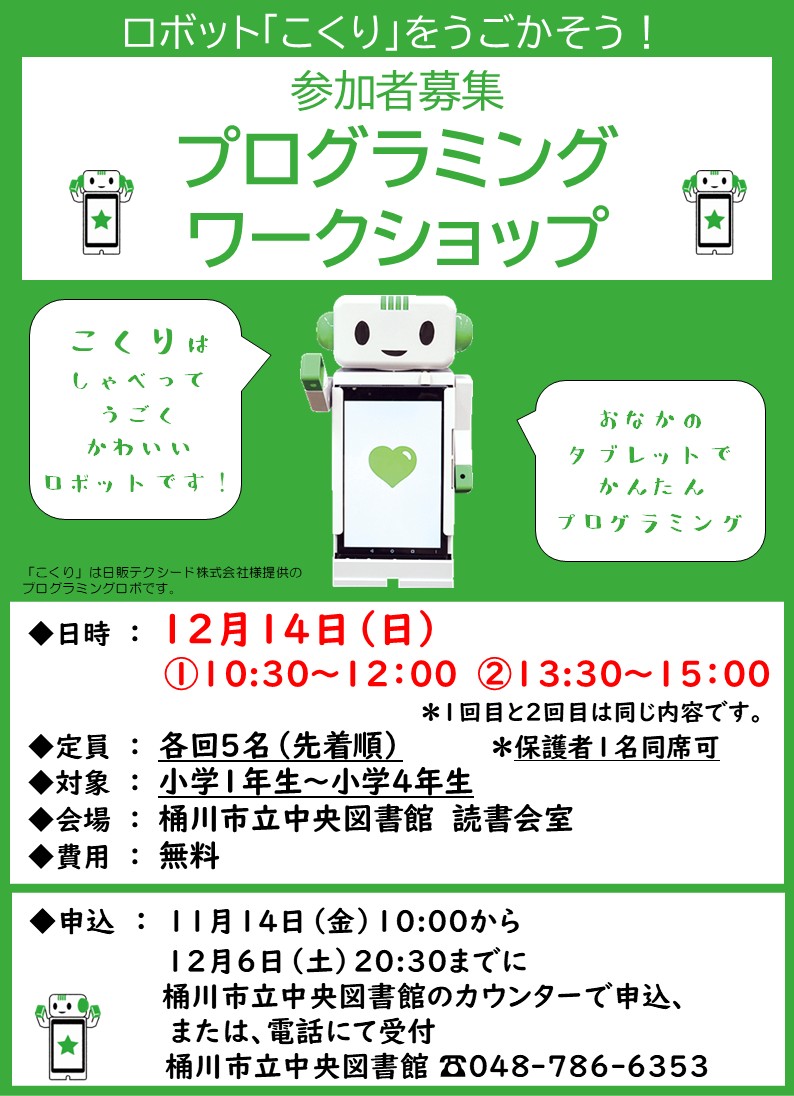 | 詳細内容 | プログラミングワークショップ ロボット「こくり」をうごかそう! 中央図書館にロボット「こくり」がやってきます! こくりをつかってプログラミングを学ぼう! |