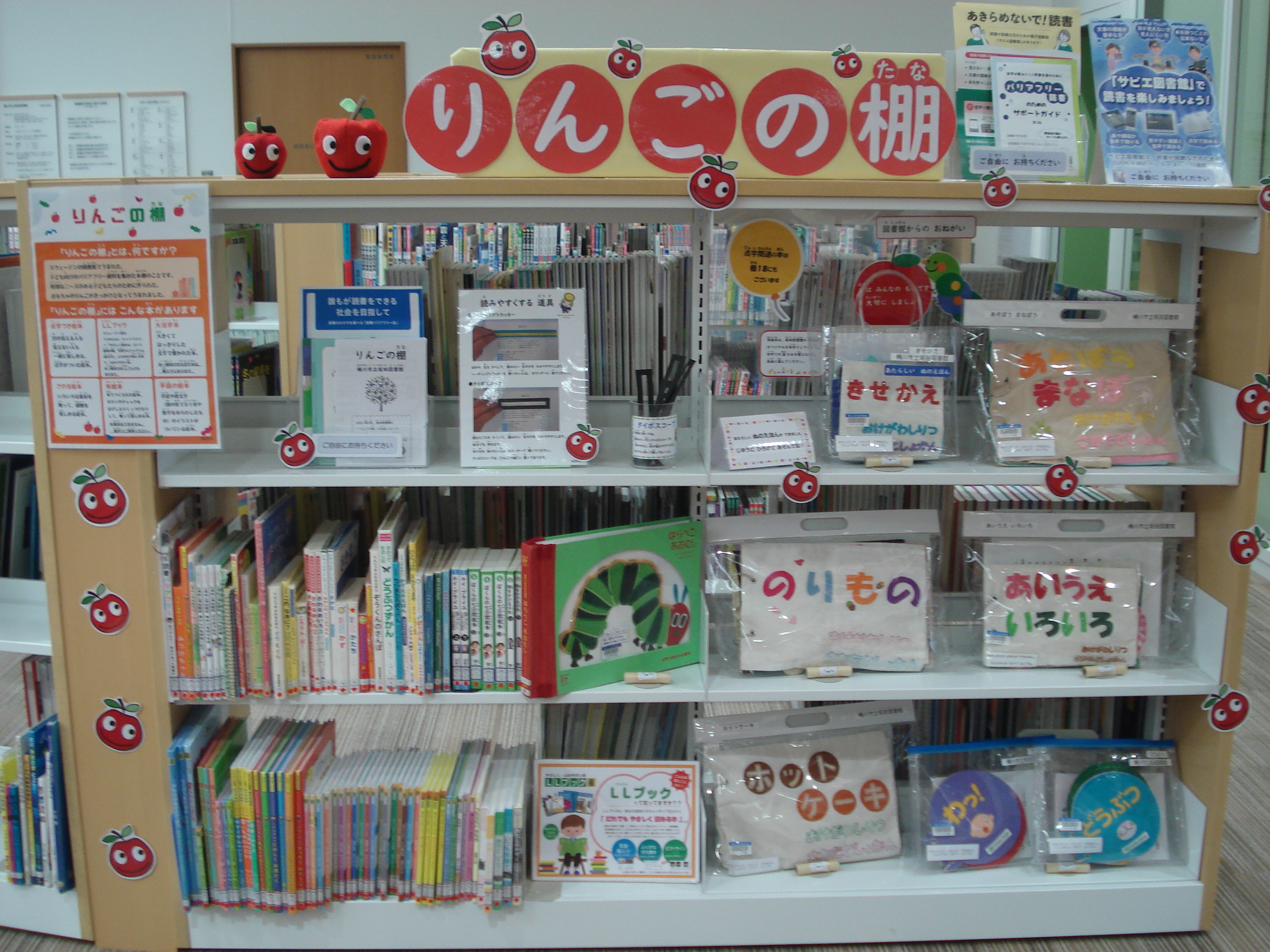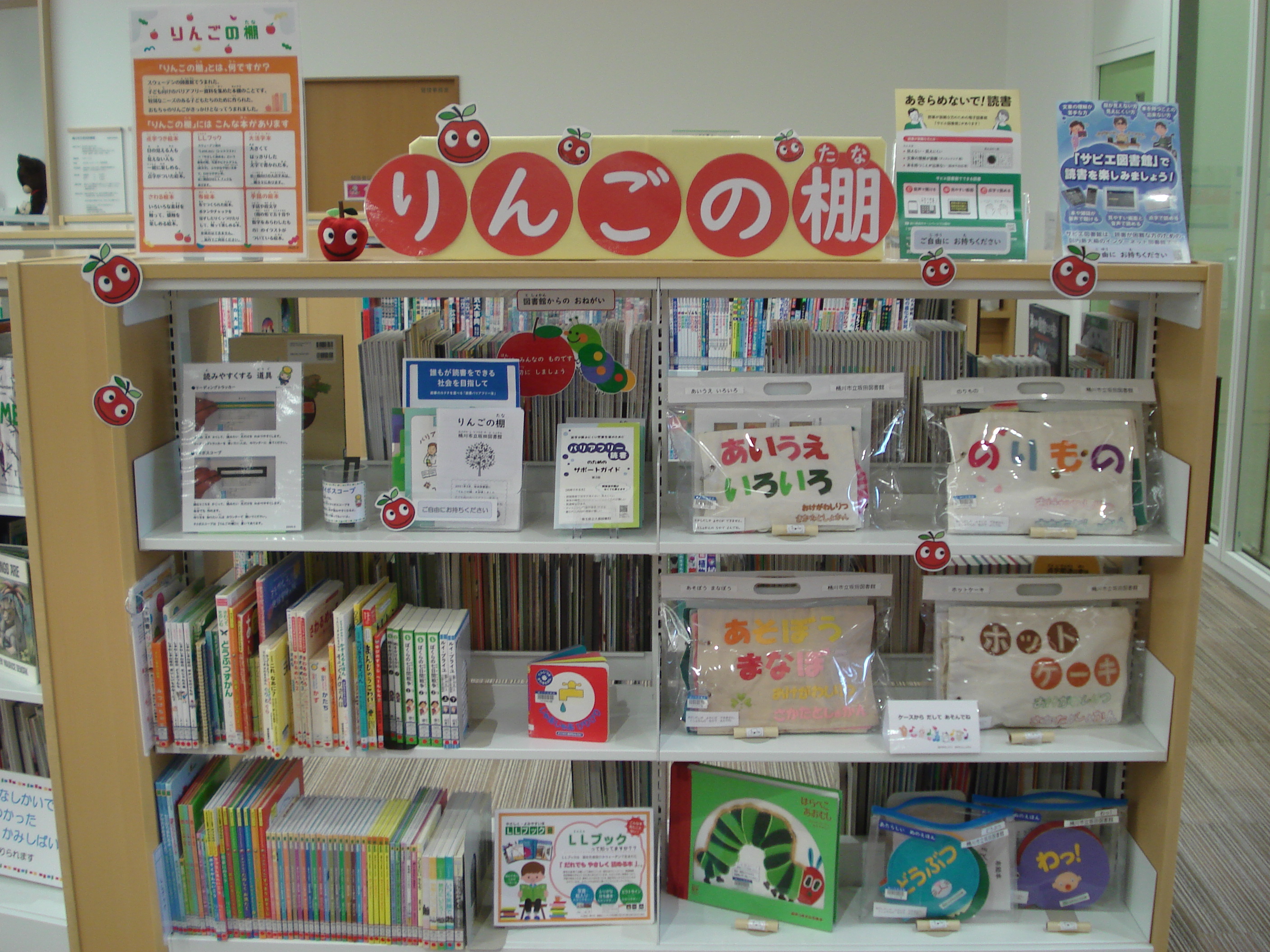 | 詳細内容 | 2021年3月、坂田図書館に「りんごの棚」を設置しました。 子ども向けのバリアフリー資料を集めています。 どうぞご利用ください。 「りんごの棚」とは、何ですか? スウェーデンの図書館でうまれた、子ども向けのバリアフリー資料を集めた本棚のことです。 特別なニーズのある子どもたちのために作られた、おもちゃのりんごがきっかけとなってうまれました。 「りんごの棚」には、どんな本がありますか? 主に、以下の6種類の資料があります。